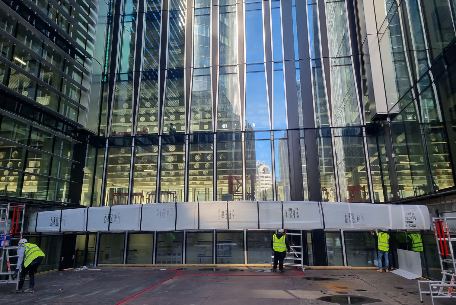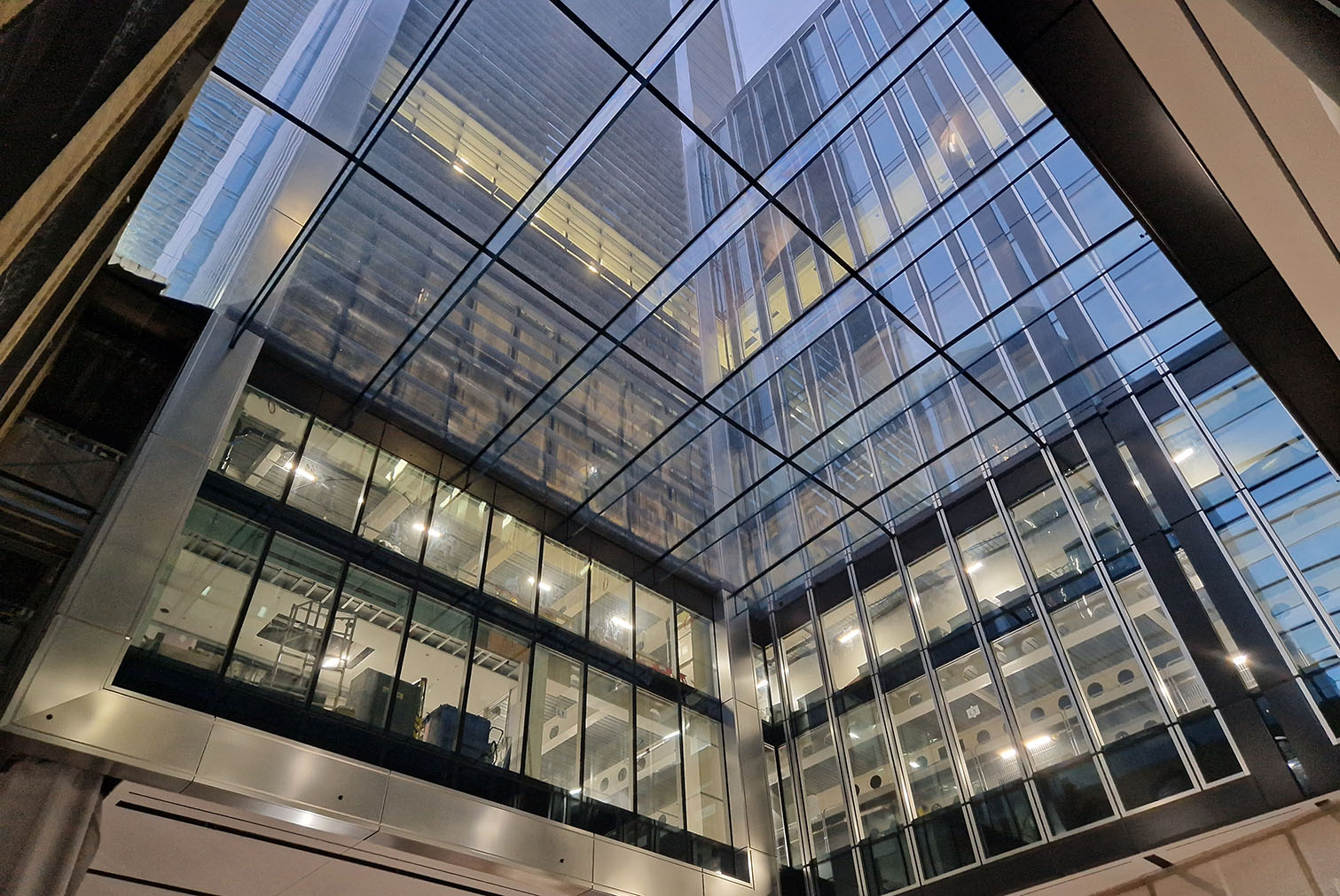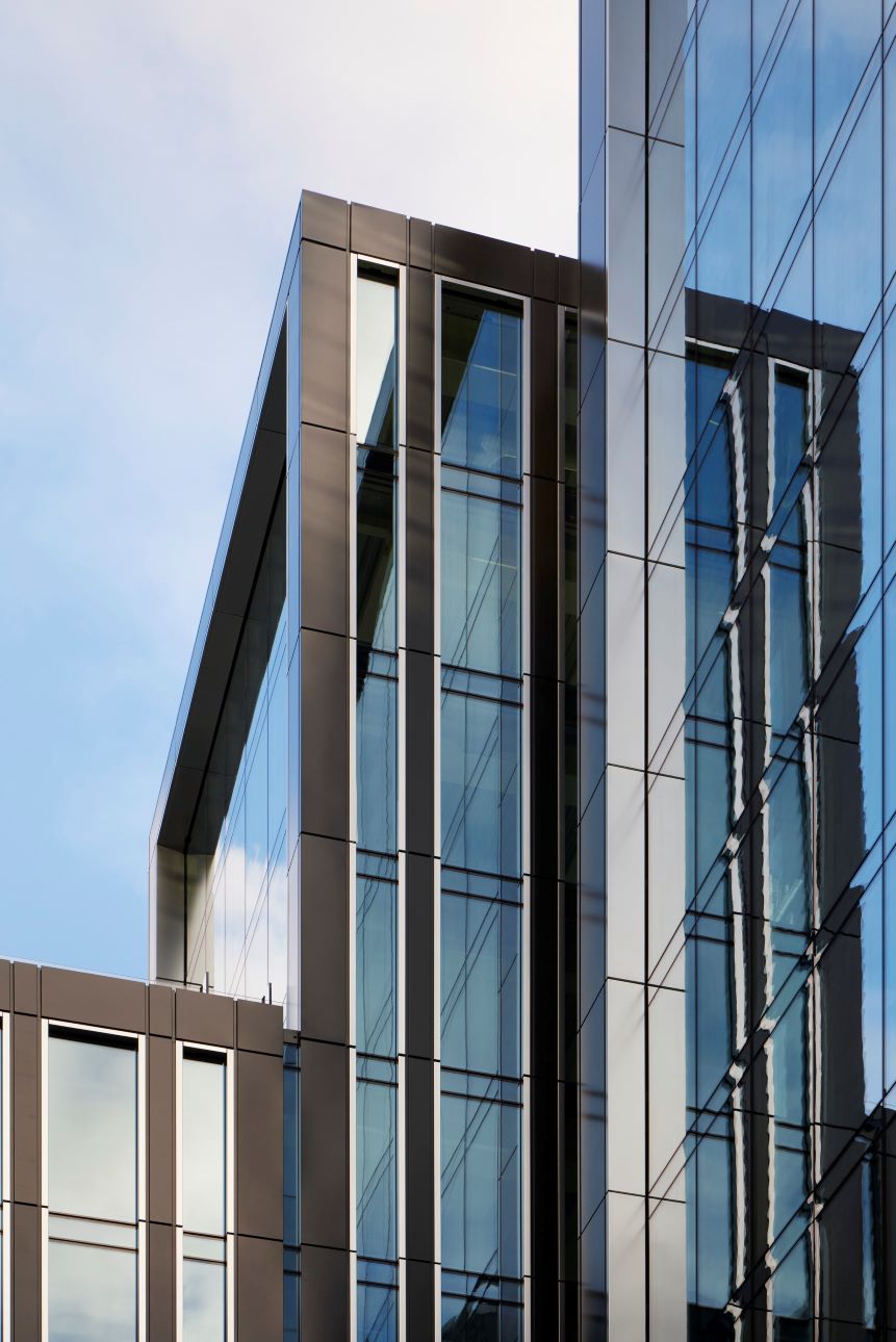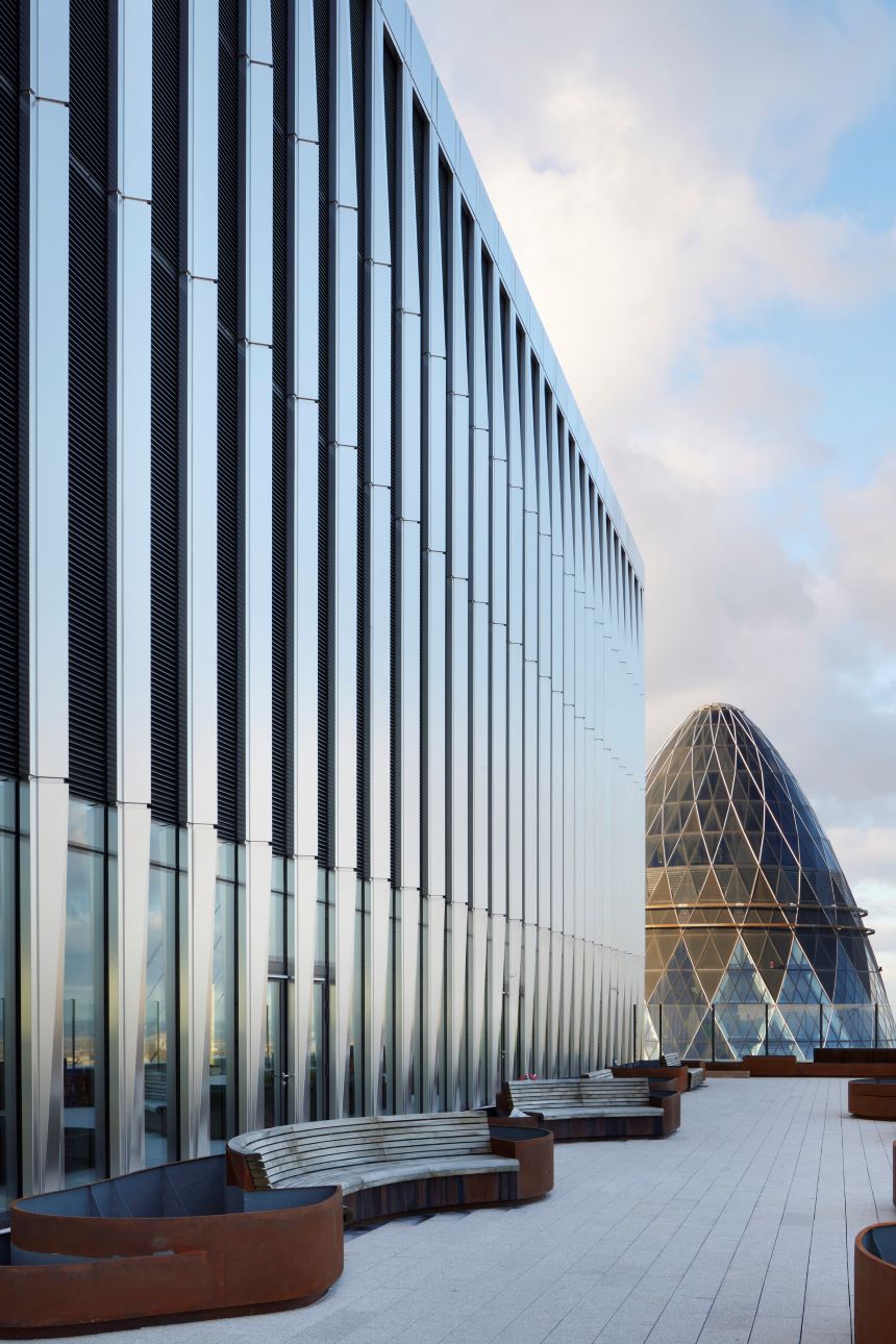 Il glazed roof si collega al livello 3 con le facciate a cellule strutturali mediante un sistema incapsulato di canali di gronda che scaricano le acque meteoriche.