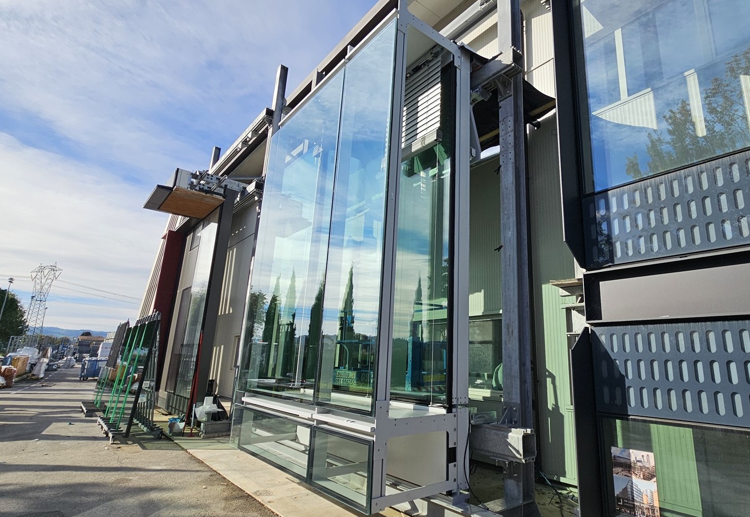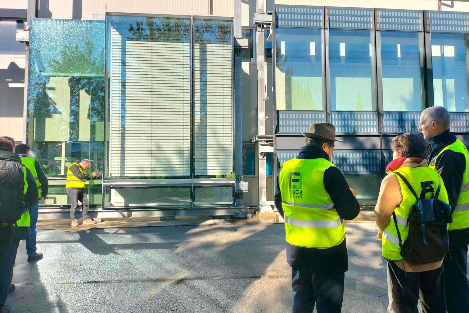 Fronte Sud: Cellule vetrate a doppia pelle con sistema a silicone strutturale. Triplo vetro internamente ed esternamente vetro stratificato (soluzione integrata con tende a veneziana nell'intercapedine tra le due pelli e tende a rullo interna).