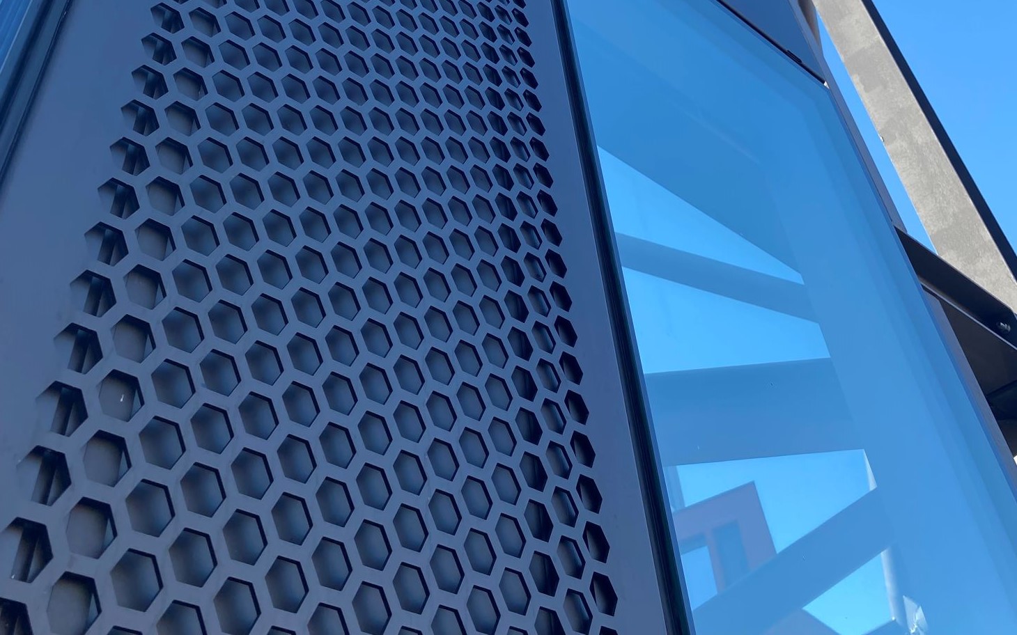 Cellule vetrate a silicone strutturale con vetro triplo, apertura pannellate ad anta interna con lamiera di alluminio forata e units pannellate. I prospetti sud e ovest sono caratterizzati dalla presenza di pinne verticali in alluminio.