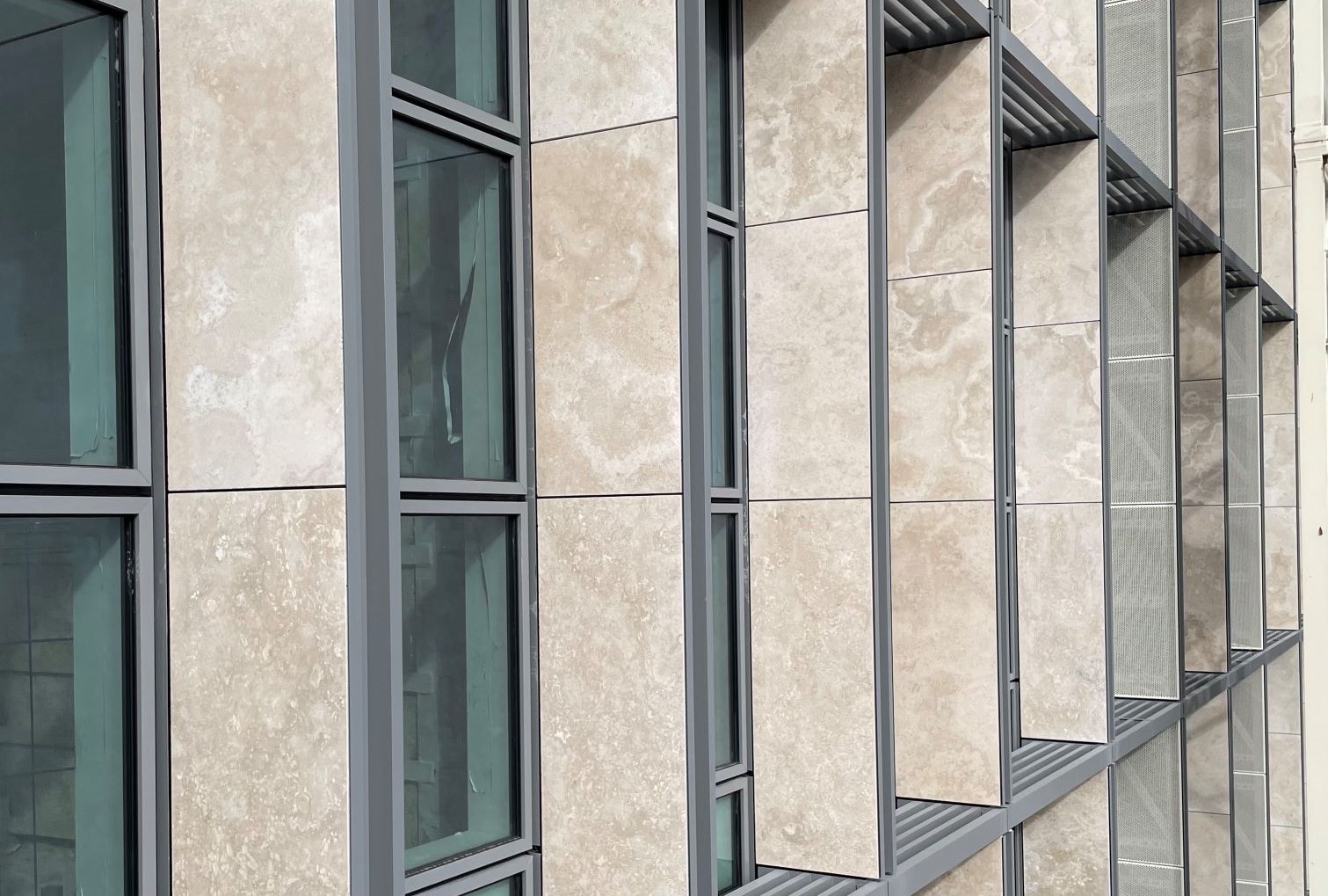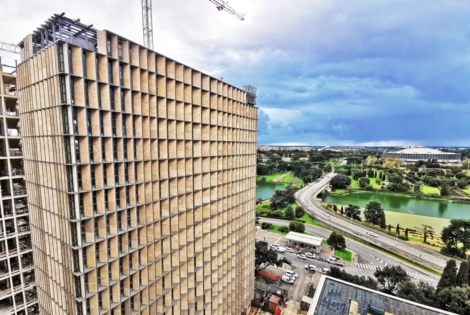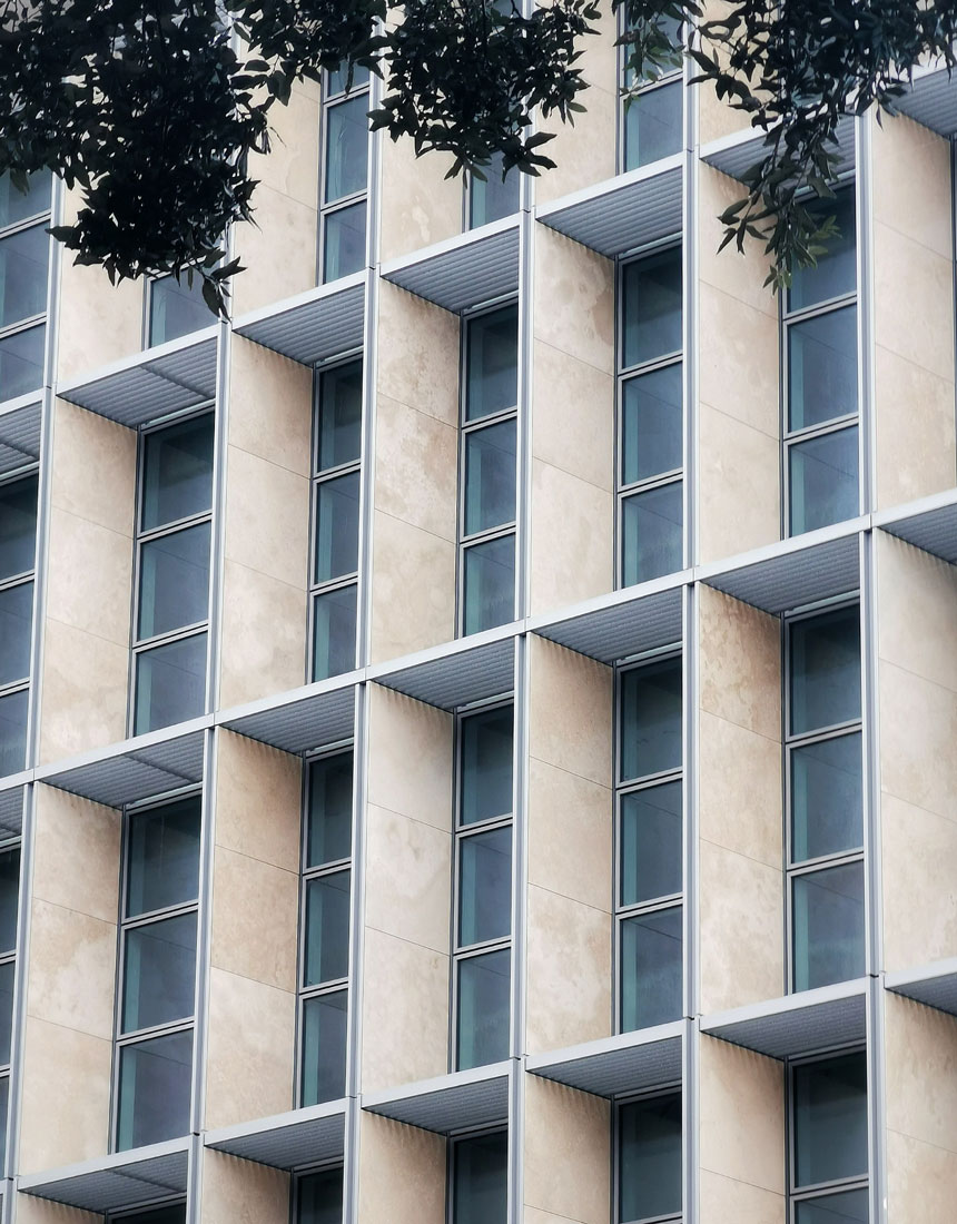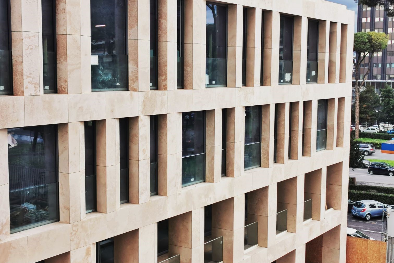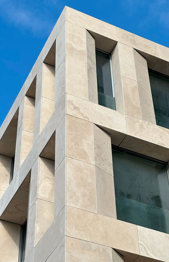 Di particolare impatto visivo sono anche le “Lesene”, elementi verticali sporgenti fino a un metro realizzati in acciaio inox AISI 441, rivestiti con lastre di Travertino Romano, una scelta di materiali che richiama la tradizione storica romana e conferisce al complesso un tono di prestigio e solidità.