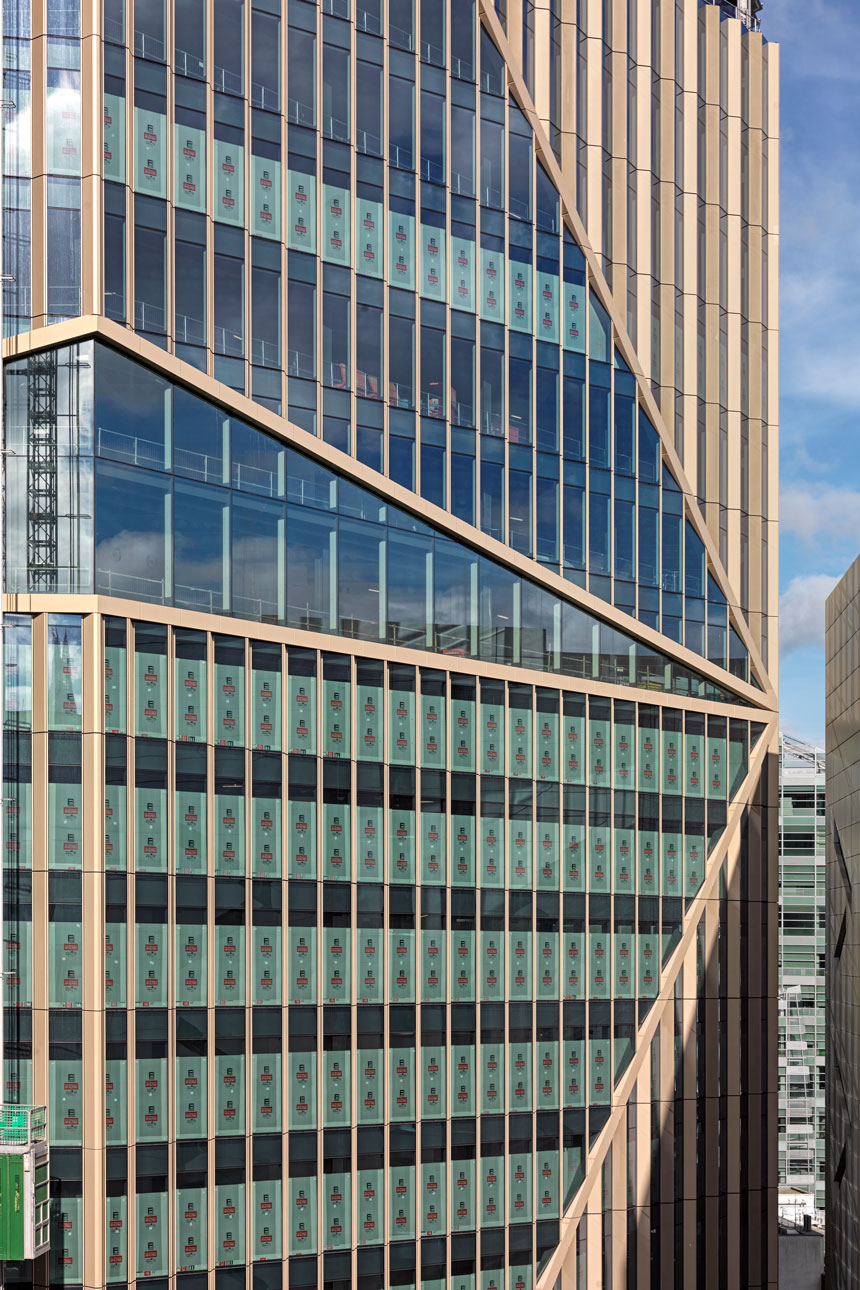 1_PODIUM, EAST TOWER, WEST TOWER_Unitised structurally silicone glazed system with a "sawtooth" shape. The units are composed of a double glazed vision areas with high performance solar control coatings, double glazed shadow box spandrel panels, and opaque panels, externally clad with aluminium presswork, either solid or perforated with a golden-sand coloured finish. Motorised purge vents incorporated behind perforated panels offer natural ventilation. The project is characterized by projecting metal elements, with external aluminium presswork panels,which diagonally cross the two towers at different inclinations, intersecting the units and providing a complex and interesting 3D geometry.