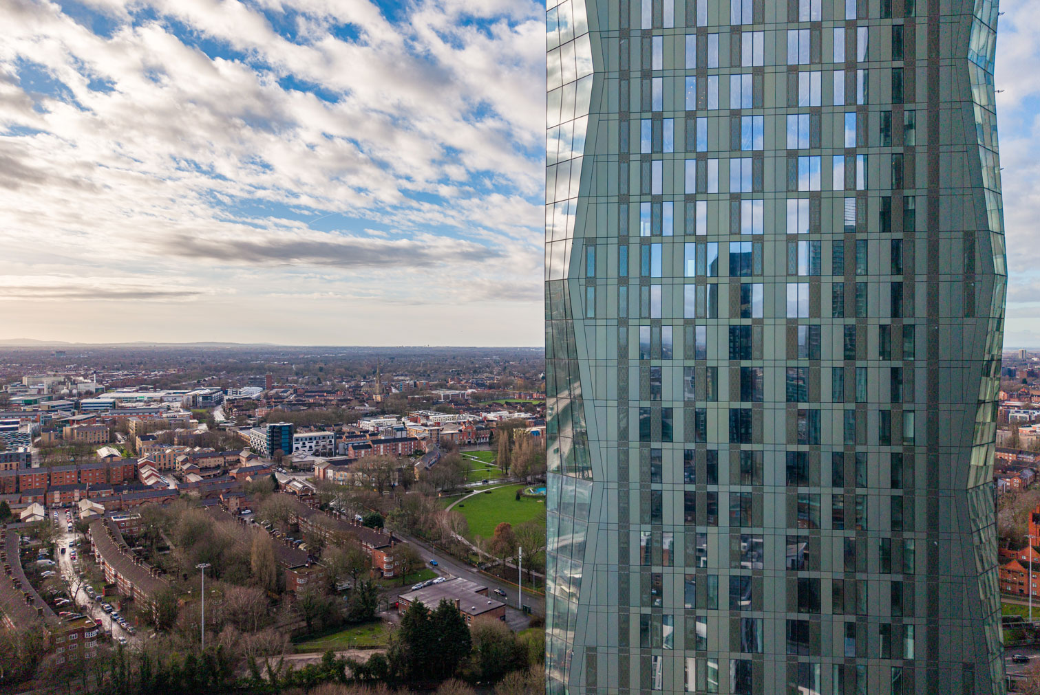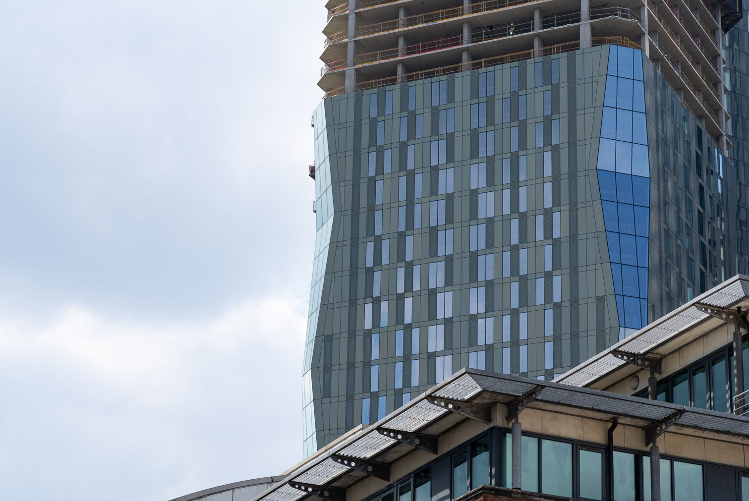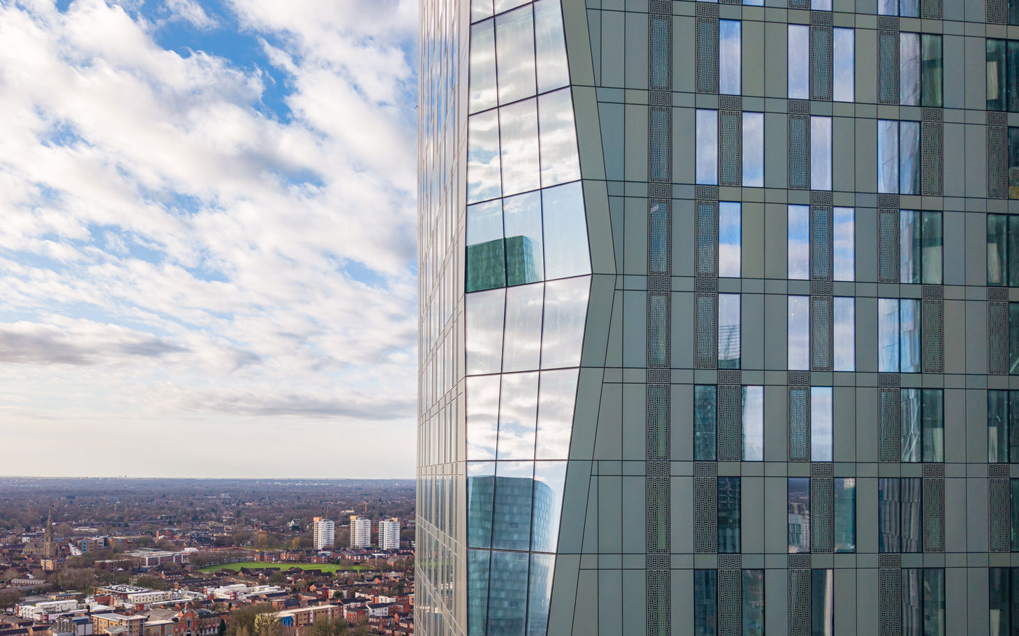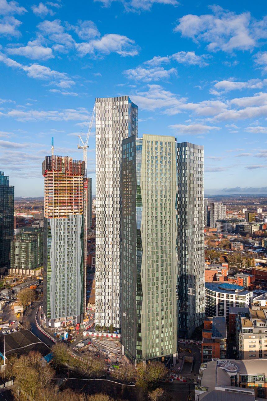 The architectural firm SimpsonHaugh has designed the project, which share a distinctive aesthetic characterized by chamfered edges that increase and decrease progressively every five floors, creating a dynamic vertical movement. The chamfered corners are fully glazed, producing highly reflective angular facets, while the main facades of the towers are clad in colored anodized aluminum, offering a visually contrasting surface.