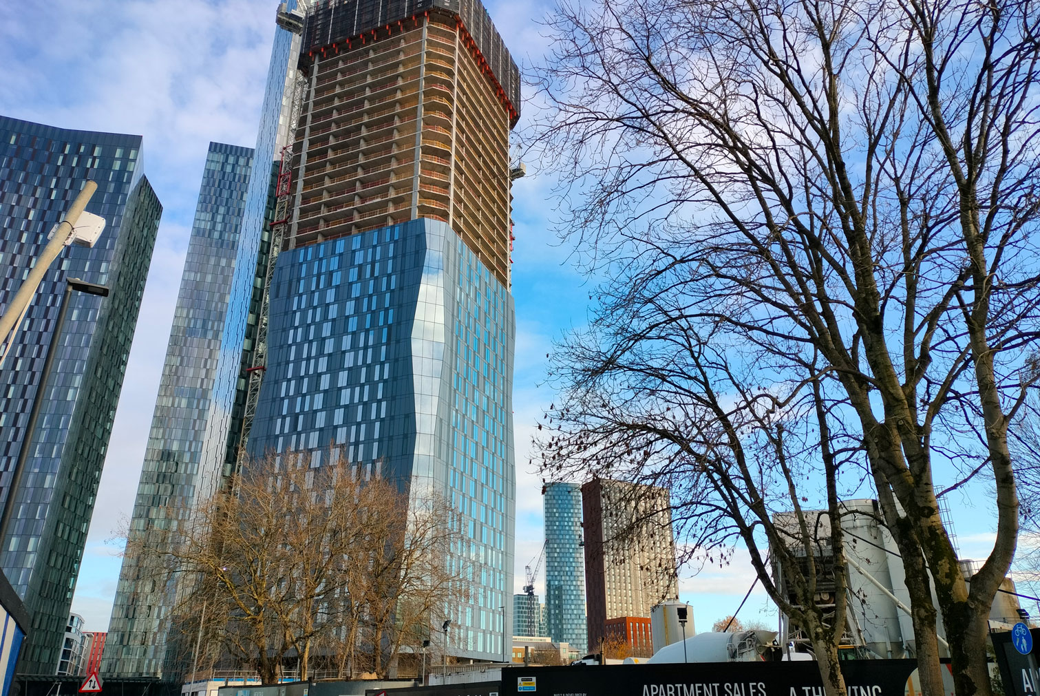 SEE ON STREETVIEWContour Plot F development comprises two 51-story residential tower, providing nearly 988 apartments as part of the Great Jackson Street masterplan. Situated near Deansgate at the southern edge of the city center, the buildings offer extensive amenities for residents, including co-working spaces, a gym, and a lounge.